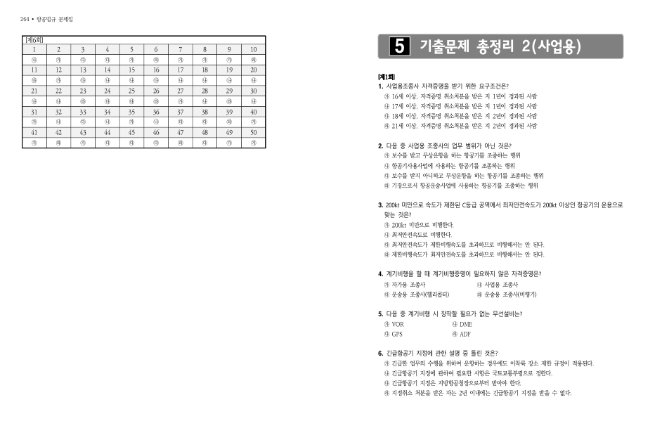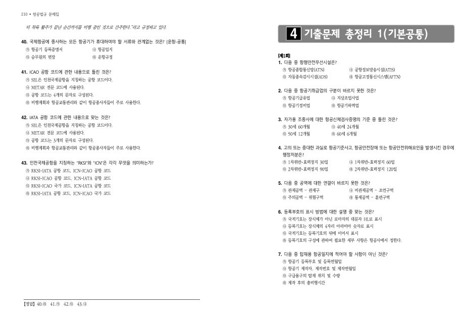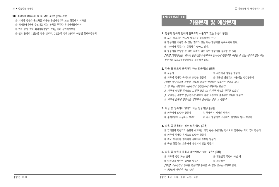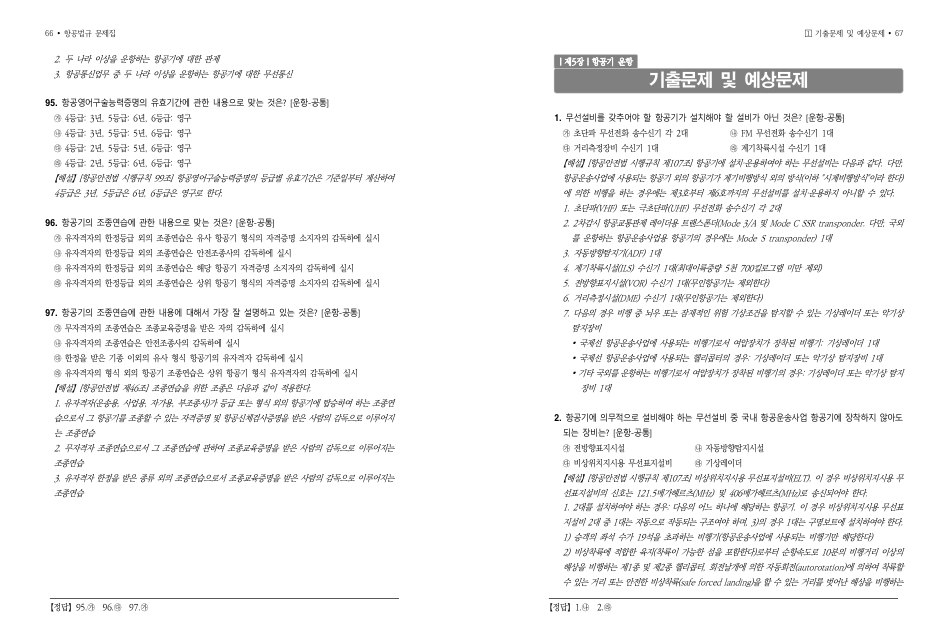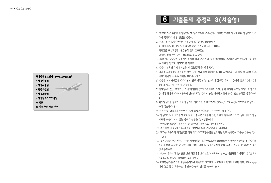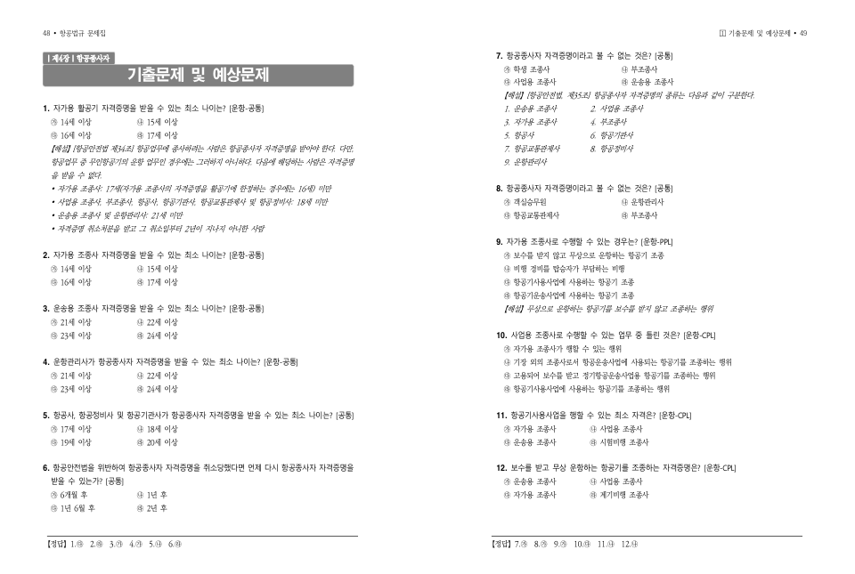 항공법규 문제집(항공안전법)은 기본과정부터 필수과목으로 학습하기 시작해서 운송용 과정까지 대부분 내용이 중복된다. 또한, 항공종사자는 항공법규의 해설 등을 다루기보다 관련 행위에 관한 법 조항에 관한 지식을 다루었다.